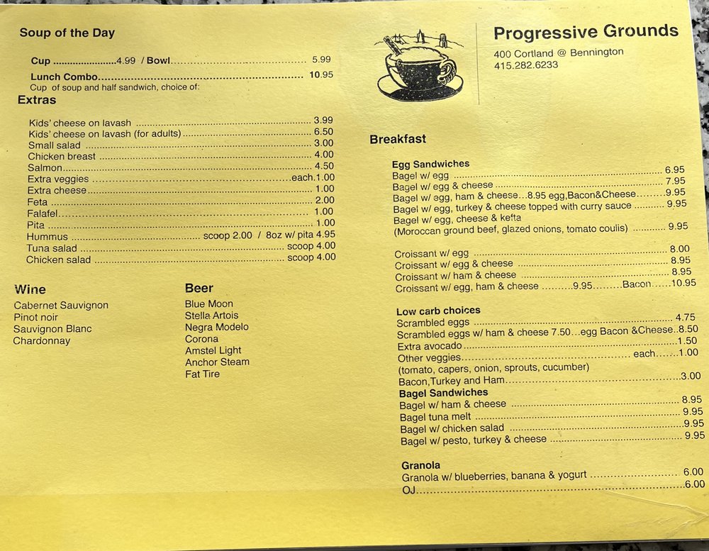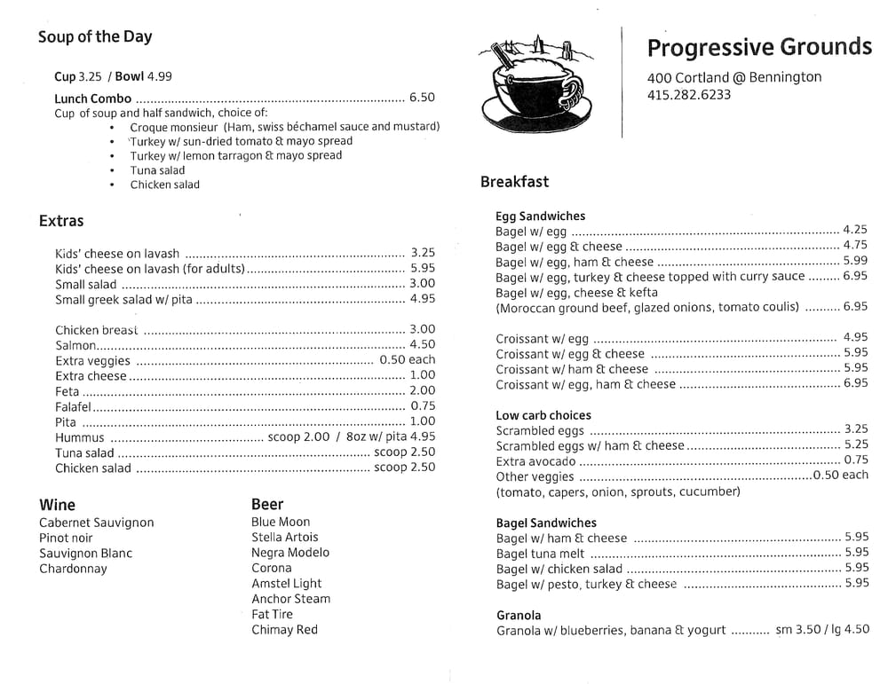 Introducing Progressive Grounds, a charming neighborhood cafe located in Bernal Heights, San Francisco. This cozy spot offers a variety of breakfast and brunch options, along with a selection of coffee, tea, sandwiches, and Moroccan-inspired dishes that set it apart from other cafes. Customers rave about the delicious croissants, wraps, and Mediterranean plates. The outdoor patio is a favorite spot for patrons to enjoy their meals, work, or catch up with friends. With friendly staff, fast service, and a welcoming atmosphere, Progressive Grounds has become a go-to destination for locals and visitors alike. Whether you're looking for a quiet place to read or a gathering spot for a group, this cafe has something for everyone. Don't miss out on their specialty drinks, comfy seating areas, and unique menu offerings that make each visit special.